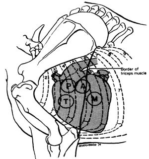 Pulmonalklappe u. Aortenklappe: links vorne, oft unter dem linken Vorderbein/Schulter (3/4 ICR):